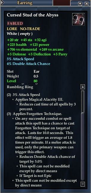 On any successful combat or spell attack this spell has a chance to cast Forgotten Technique on target of attack. Lasts for 10.0 seconds. This effect will trigger an average of 1.8 times per minute. If a melee attack is used, only the primary weapon can trigger this effect.