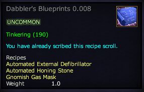 Dabbler's Blueprints 0.008 76,461 pages on this wiki Edit Edit source History Talk 0 In-Game Examine Window Dabbler's Blueprints 0.008 other resources LootDB · EQ2LL · ZAM · EQ2U · Census xml EverQuest II Recipe Book Information Dabbler's Blueprints 0.008 UNCOMMON Tinkering (190) Recipes Automated External Defibrillator Automated Honing Stone Gnomish Gas Mask Obtain: Bought from Tinkering Trainer Merchants Link: What does this information mean? Categories : Recipe Books Tinkering Recipe Books Uncommon Recipe Books Add category Cancel Save