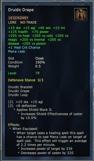 Druidic Drape 76,461 pages on this wiki Edit Edit source History Talk 0 In-Game Examine Window Druidic Drape other resources EQ2U · LootDB · EQ2LL · ZAM · Census xml Druidic Drape LEGENDARY LORE NO-TRADE +15 agi +40 wis +15 int +15 sta +205 vs elemental +205 vs noxious +205 vs arcane 1% Crit Chance Mana Leak Slot Cloak Level 79 ( Tier 8 ) Effects: When Equipped: When target casts a healing spell this spell has a chance to cast Mana leak on target of spell cast. This effecdt will trigger an average of 2.2 times per minute. Increases power of target by 336 Decreases power of caster by 320