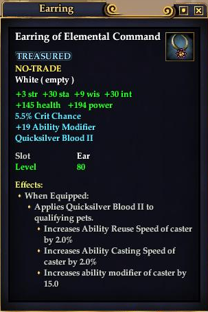 Earring of Elemental Command 76,461 pages on this wiki Edit Edit source History Talk 0 In-Game Examine Window Earring of Elemental Command other resources EQ2U · LootDB · EQ2LL · ZAM · Census xml Earring of Elemental Command TREASURED NO-TRADE +3 str +9 wis +30 int +30 sta 5.5% Crit Chance +19 Ability Modifier Quicksilver Blood II Slot Ear Level 80 ( Tier 9 ) Effects: When Equipped: Applies Quicksilver Blood II to qualifying pets. Increases Ability Reuse Speed of target by 2.0% Increases Ability Casting Speed of target by 2.0% Increases ability modifier of target by 15.0