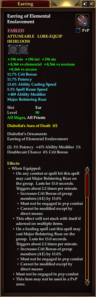 Earring of Elemental Enslavement 76,461 pages on this wiki Edit Edit source History Talk 0 In-Game Examine Window Earring of Elemental Enslavement other resources EQ2U · LootDB · EQ2LL · ZAM · Census xml Earring of Elemental Enslavement FABLED ATTUNEABLE LORE-EQUIP HEIRLOOM +196 wis +196 int +196 sta +8,366 vs elemental +8,366 vs noxious +8,366 vs arcane 11.7% Crit Bonus 11.7% Potency 13.4% Ability Casting Speed 5.3% Spell Reuse Speed +409 Ability Modifier Major Bolstering Roar Slot Ear Level 90 ( Tier 10 ) All Mages , All Priests Effects: When Equipped: On a healing spell cast this spell may cast Major Bolstering Roar on the group. Lasts for 15.0 seconds. Triggers about 2.2 times per minute. Increases Crit Bonus of group members (AE) by 15.0% Must not be engaged in pvp combat Cannot be modified except by direct means This effect will not stack with itself if adorned on multiple items. On any combat or spell hit this spell may cast Major Bolstering Roar on the group. Lasts for 15.0 seconds. Triggers about 2.2 times per minute. Increases Crit Bonus of group members (AE) by 15.0% Must not be engaged in pvp combat Cannot be modified except by direct means Must not be engaged in pvp combat This item may not be used in a PvP zone.