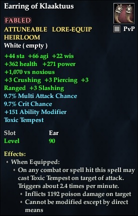 Earring of Klaaktuus 76,461 pages on this wiki Edit Edit source History Talk 0 In-Game Examine Window Earring of Klaaktuus other resources EQ2U · LootDB · EQ2LL · ZAM · Census xml Earring of Klaaktuus FABLED ATTUNEABLE LORE-EQUIP HEIRLOOM +66 agi +22 wis +44 sta +1,070 vs noxious +3 Crushing +3 Piercing +3 Ranged +3 Slashing Toxic Tempest Slot Ear Level 90 ( Tier 10 ) Effects: When Equipped: On any combat or spell hit this spell may cast Toxic Tempest on target of attack. Triggers about 2.0 times per minute. Inflicts [ information needed ] poison damage on target Cannot be modified except by direct means Must not be engaged in pvp combat This item may not be used in a PvP zone.