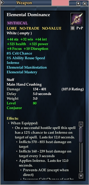 Elemental Dominance < Elemental Dominance (Mythical) > 76,463 pages on this wiki Edit Edit source History Talk 2 In-Game Examine Window Elemental Dominance (Mythical) other resources EQ2U · LootDB · EQ2LL · ZAM · Census xml Elemental Dominance MYTHICAL LORE NO-TRADE NO-VALUE +32 wis +64 int +44 sta +8 Focus +10 Disruption 8% Crit Chance 5% Ability Reuse Speed Inferno Elemental Manifestation Elemental Mastery Staff Main Hand Crushing Damage 134-401 (107.0 Rating) Delay 5.0 seconds Level 80 ( Tier 9 ) Conjuror Effects: When Equipped: On a successful hostile spell this spell has a 12% chance to cast Inferno on target of spell. Lasts for 12.0 seconds. Applies Inferno. Lasts for 12.0 seconds. Increases Damage Spell Crit Chance of pet by 20.0% Prevents AOE (except when direct) Inflicts 581-872 heat damage on target Inflicts 163-244 heat damage on target every 3 seconds This spell can not be modified except by direct means. Applies Elemental Manifestation when Activated. Summons a pet Elemental Manifestation. The casting time of Elemental Manifestation is 10.0 seconds and the reuse time of the spell is 2.0 seconds When Equipped Increases the base damage of hostile spells by 10%