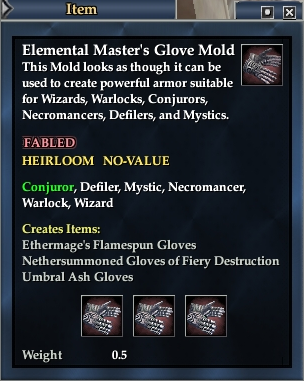 When you have all items needed for the armor piece, purchase the pattern from Assilus Poisonbolt at the docks in Lavastorm for an Elemental Master's Glove Mold and 5 Void Shards . Then buy the armor piece from Borden Chargehammer at the docks in Lavastorm for an Elemental Master's Glove Pattern and one of the following, depending on your class: