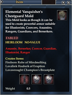 When you have all items needed for the armor piece, purchase the pattern from Assilus Poisonbolt at the docks in Lavastorm for an Elemental Vanquisher's Chestguard Mold and 10 Void Shards . Then buy the armor piece from Borden Chargehammer at the docks in Lavastorm for an Elemental Vanquisher's Chestguard Pattern and one of the following, depending on your class: