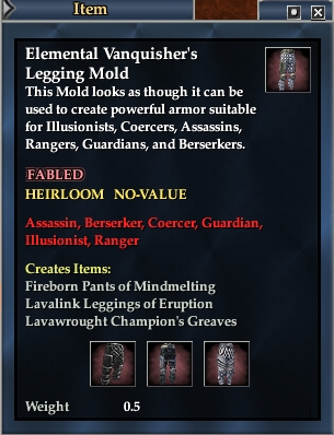 When you have all items needed for the armor piece, purchase the pattern from Assilus Poisonbolt at the docks in Lavastorm for an Elemental Vanquisher's Legging Mold and 8 Void Shards . Then buy the armor piece from Borden Chargehammer at the docks in Lavastorm for an Elemental Vanquisher's Legging Pattern and one of the following, depending on your class: