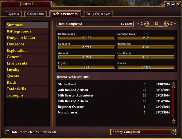 A screenshot of the Achievements tab of the Journal as it appears in the standard UI in 2014.