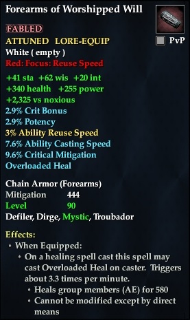Forearms of Worshipped Will 76,461 pages on this wiki Edit Edit source History Talk 0 In-Game Examine Window Forearms of Worshipped Will other resources EQ2U · LootDB · EQ2LL · ZAM · Census xml Forearms of Worshipped Will FABLED ATTUNABLE LORE-EQUIP HEIRLOOM +62 wis +20 int +41 sta +2,325 vs noxious 2.9% Crit Bonus 2.9% Potency 7.6% Ability Casting Speed Overloaded Heal Chain Armor ( Forearms ) Mitigation 444 Level 90 ( Tier 10 ) Defiler , Mystic , Dirge , Troubador Effects: When Equipped: On a healing spell cast this spell may cast Overloaded Heal on caster. Triggers about 3.0 times per minute. Heals group members (AE) for 583 Cannot be modified except by direct means
