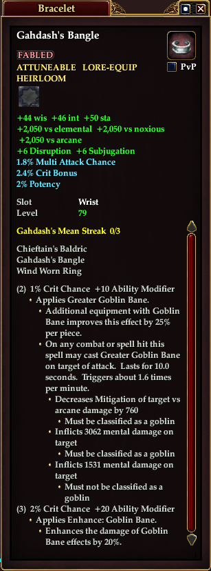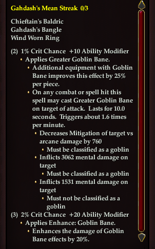 On any combat or spell hit this spell may cast Greater Goblin Bane on target of attack. Lasts for 10.0 seconds. Triggers about 1.6 times per minute.