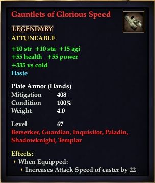 Gauntlets of Glorious Speed 76,461 pages on this wiki Edit Edit source History Talk 0 In-Game Examine Window Gauntlets of Glorious Speed other resources EQ2U · LootDB · EQ2LL · ZAM · Census xml Gauntlets of Glorious Speed LEGENDARY ATTUNEABLE +10 str +15 agi +10 sta +335 vs elemental Haste Plate Armor ( Hands ) Mitigation 408 Level 67 ( Tier 7 ) Berserker , Guardian , Paladin , Shadowknight , Inquisitor , Templar Effects: When Equipped Increases Attack Speed of caster by 22
