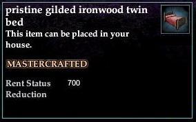 Gilded Ironwood Twin Bed 76,461 pages on this wiki Edit Edit source History Talk 0 In-Game Examine Window Gilded Ironwood Twin Bed other resources EQ2U · LootDB · EQ2LL · ZAM · Census xml EverQuest II Item Information Type : House Item Subtype : Bed Gilded Ironwood Twin Bed This item can be placed in your house or guild hall. MASTERCRAFTED Rent Status Reduction 700 Obtain: Carpenter -crafted using a level 59 recipe from Advanced Carpenter Volume 59 . What does this information mean? Categories : Items House Item (Item Type) Bed (Item Subtype) Mastercrafted Items Items with Rent Status Reduction Tier 6 RSR Items Articles missing itemlink Item pages with existing default images Add category Cancel Save