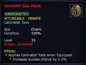 Gnomish Gas Mask 76,461 pages on this wiki Edit Edit source History Talk 0 In-Game Examine Window Gnomish Gas Mask other resources EQ2U · LootDB · EQ2LL · ZAM · Census xml Gnomish Gas Mask HANDCRAFTED ATTUNEABLE ORNATE Calibrated Tools Slot Charm (Optional) Level 40 ( Tier 5 ) Effects: Applies Calibrated Tools when Equipped. Increases success chance by 2.0%