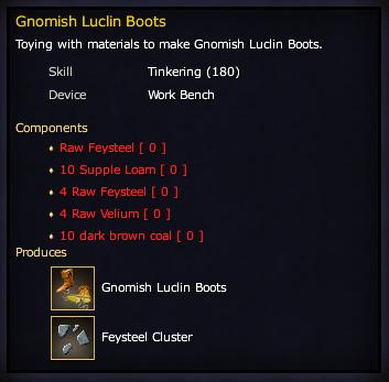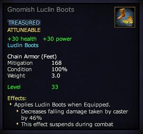 Gnomish Luclin Boots 76,461 pages on this wiki Edit Edit source History Talk 0 In-Game Examine Window Gnomish Luclin Boots other resources EQ2U · LootDB · EQ2LL · ZAM · Census xml Gnomish Luclin Boots TREASURED ATTUNEABLE Luclin Boots Chain Armor ( Feet ) Mitigation 168 Level 33 ( Tier 4 ) Effects: Applies Luclin Boots when Equipped. Decreases falling damage taken by caster by 46% This effect suspends during combat