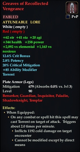 Greaves of Recollected Vengeance 76,461 pages on this wiki Edit Edit source History Talk 0 In-Game Examine Window Greaves of Recollected Vengeance other resources EQ2U · LootDB · EQ2LL · ZAM · Census xml Greaves of Recollected Vengeance FABLED ATTUNABLE LORE-EQUIP HEIRLOOM +62 str +20 agi +41 sta +2,092 vs elemental +1,163 vs noxious 12.6% Crit Bonus 2.8% Potency +85 Ability Modifier Torrent Plate Armor ( Legs ) Mitigation 679 Level 90 ( Tier 10 ) Berserker , Guardian , Paladin , Shadowknight , Inquisitor , Templar Effects: When Equipped: On any combat or spell hit this spell may cast Torrent on target of attack. Triggers about 2.0 times per minute. Inflicts 1192 cold damage on target encounter Must not be engaged in pvp combat Cannot be modified except by direct means Must not be engaged in pvp combat This item may not be used in a PvP zone.
