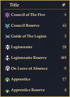 The guild rank system has undergone major overhaul no fewer than five times in the past four years. Currently, the system provides for basic differentiation between the leadership, the membership, and the apprenticeship, while further differentiating between main characters and alternative characters, or alts.