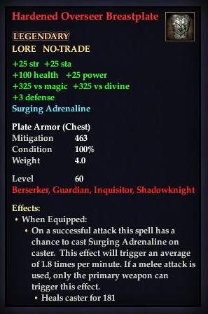 Hardened Overseer Breastplate 76,461 pages on this wiki Edit Edit source History Talk 0 In-Game Examine Window Hardened Overseer Breastplate other resources EQ2U · LootDB · EQ2LL · ZAM · Census xml Hardened Overseer Breastplate LEGENDARY LORE NO-TRADE +25 str +25 sta +325 vs arcane +3 Defense Surging Adrenaline Plate Armor ( Chest ) Mitigation 463 Level 60 ( Tier 7 ) Berserker , Guardian , Paladin , Shadowknight Effects: When Equipped: On a successful attack this spell has a chance to cast Surging Adrenaline on caster. This effect will trigger an average of 1.8 times per minute. If a melee attack is used, only the primary weapon can trigger this effect. Heals caster for 181