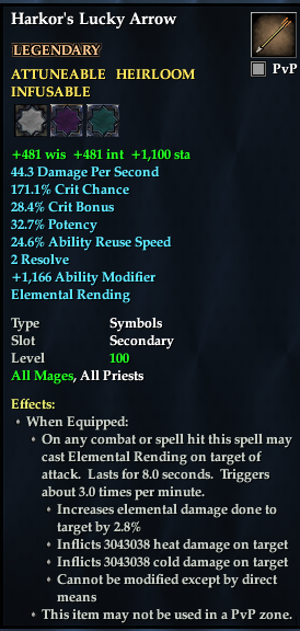 Harkor's Lucky Arrow 76,461 pages on this wiki Edit Edit source History Talk 0 In-Game Examine Window Harkor's Lucky Arrow other resources EQ2U · LootDB · EQ2LL · ZAM · Census xml Harkor's Lucky Arrow LEGENDARY ATTUNABLE HEIRLOOM INFUSABLE +481 wis +481 int +1,100 sta 44.3 Damage Per Second 171.1% Crit Chance 28.4% Crit Bonus 32.7% Potency 24.6% Ability Reuse Speed +1,166 Ability Modifier 2 Resolve Elemental Rending Symbols Type Symbols Slot Secondary Level 100 ( Tier 11 ) All Mages , All Priests Effects: When Equipped: On any combat or spell hit this spell may cast Elemental Rending on target of attack. Lasts for 8.0 seconds. Triggers about 3.0 times per minute. Increases elemental damage done to target by 2.8% Inflicts 3,043,038 heat damage on target Inflicts 3,043,038 cold damage on target Cannot be modified by direct means This item may not be used in a PvP zone.