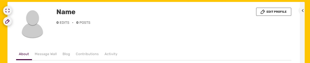 The Profile tab is a blank wiki page that you can use to express yourself. Simply click the "Edit Profile" button at the top of this section, and start editing. We recommend you add links, photos, and information to express yourself and your interest in that community.