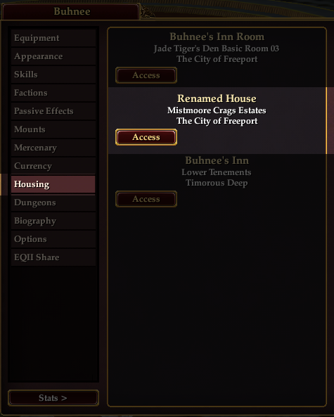 - The image of the Character window above (with an example of a renamed house on the list) shows the shortcut button, labeled Access that opens the Housing and Leaderboard window, so you can enter instantly.