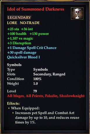 Idol of Summoned Darkness 76,461 pages on this wiki Edit Edit source History Talk 0 In-Game Examine Window Idol of Summoned Darkness other resources EQ2U · LootDB · EQ2LL · ZAM · Census xml Idol of Summoned Darkness LEGENDARY LORE NO-TRADE +36 int +25 sta +1,107 vs arcane +3 Disruption 1% Crit Chance +30 Ability Modifier Quicksilver Blood I Symbols Type Symbols Slots Secondary, Ranged Level 79 ( Tier 8 ) All Mages , All Priests , Paladin , Shadowknight Effects: When Equipped: Increases pet Spell and Combat Art damage by up to 10, and reduces reuse times by 1%.