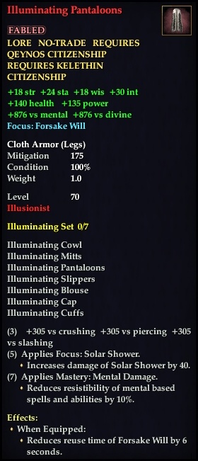 Illuminating Pantaloons 76,461 pages on this wiki Edit Edit source History Talk 0 In-Game Examine Window Illuminating Pantaloons other resources EQ2U · LootDB · EQ2LL · ZAM · Census xml Illuminating Pantaloons FABLED LORE NO-TRADE GOOD ONLY +18 str +18 wis +30 int +24 sta +876 vs arcane Focus: Forsake Will Cloth Armor ( Legs ) Mitigation 175 Level 70 ( Tier 8 ) Illusionist Effects: When Equipped: Reduces reuse time of Forsake Will by 6 seconds.