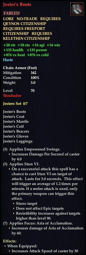 Jester's Boots 76,461 pages on this wiki Edit Edit source History Talk 0 In-Game Examine Window Jester's Boots other resources EQ2U · LootDB · EQ2LL · ZAM · Census xml Jester's Boots FABLED LORE NO-TRADE GOOD ONLY +28 str +16 agi +16 wis +18 sta +876 vs elemental Haste Chain Armor ( Feet ) Mitigation 342 Level 70 ( Tier 8 ) Troubador Effects: When Equipped: Increases Attack Speed of caster by 30
