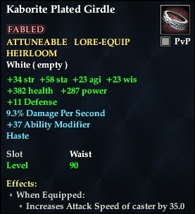 Kaborite Plated Girdle 76,461 pages on this wiki Edit Edit source History Talk 0 In-Game Examine Window Kaborite Plated Girdle other resources EQ2U · LootDB · EQ2LL · ZAM · Census xml Kaborite Plated Girdle FABLED ATTUNEABLE LORE-EQUIP HEIRLOOM +73 str +85 agi +84 sta 11% Crit Chance 3% Crit Bonus 3.4% Potency 1.4% Strikethrough 1.9% Ability Reuse Speed +56 Ability Modifier Haste Slot Waist Level 90 ( Tier 10 ) Effects: When Equipped: Increases the attack speed of caster by 35.0