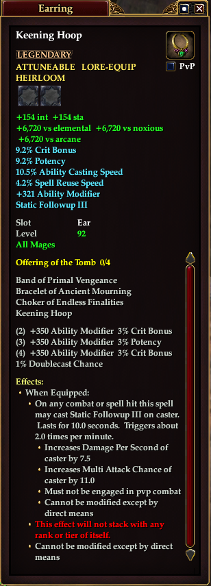 Keening Hoop 76,461 pages on this wiki Edit Edit source History Talk 0 In-Game Examine Window Keening Hoop other resources EQ2U · LootDB · EQ2LL · ZAM · Census xml Keening Hoop LEGENDARY ATTUNEABLE LORE-EQUIP HEIRLOOM +154 int +154 sta +6,720 vs elemental +6,720 vs noxious +6,720 vs arcane 9.2% Crit Bonus 9.2% Potency 10.5% Ability Casting Speed 4.2% Spell Reuse Speed +321 Ability Modifier Static Followup III Slot Ear Level 92 ( Tier 10 ) All Mages Effects: When Equipped: On any combat or spell hit this spell may cast Static Followup on caster. Lasts for 10.0 seconds. Triggers about 2.0 times per minute. Increases Damage Per Second of caster by 7.5 Increases Multi Attack Chance of caster by 11.0 Must not be engaged in pvp combat Cannot be modified except by direct means This effect will not stack with any rank or tier of itself. Cannot be modified except by direct means