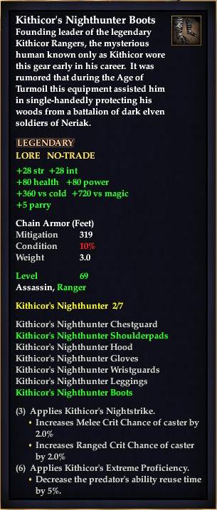 Kithicor's Nighthunter Boots 76,461 pages on this wiki Edit Edit source History Talk 0 In-Game Examine Window Kithicor's Nighthunter Boots Kithicor's Nighthunter Boots (equipped) other resources EQ2U · LootDB · EQ2LL · ZAM · Census xml Kithicor's Nighthunter Boots LEGENDARY LORE NO-TRADE +28 str +28 int +360 vs elemental +720 vs arcane +5 Parry Chain Armor ( Feet ) Mitigation 319 Level 69 ( Tier 7 ) Assassin , Ranger Obtain: From the Ornate Chest of Axxyk'Tuur in Obelisk of Blight . \aITEM -276672104 -706838225:[Kithicor's Nighthunter Boots]\/a \aITEM -276672104 -706838225:[Kithicor's Nighthunter Boots]\/a What does this information mean? Armor Set: Kithicor's Nighthunter Kithicor's Nighthunter Hood Kithicor's Nighthunter Shoulderpads Kithicor's Nighthunter Chestguard Kithicor's Nighthunter Wristguards Kithicor's Nighthunter Gloves Kithicor's Nighthunter Leggings Kithicor's Nighthunter Boots (3) Applies Kithicor's Nightstrike Increases Ranged Crit Chance of caster by 2.0% Increases Melee Crit Chance of caster by 2.0% (6) Applies Kithicor's Extreme Proficiency . Decrease the predator's ability reuse time by 5%.