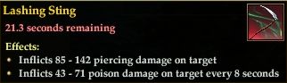 Lashing Sting 76,461 pages on this wiki Edit Edit source History Talk 0 Lashing Sting EQ2: Monster Spell Information Category (Target) DOT ( Enemy ) Casting Time Instant Recast time Instant Duration 25 seconds Inflicts 85-142 piercing damage on target Inflicts 43-71 poison damage on target every 8 seconds
