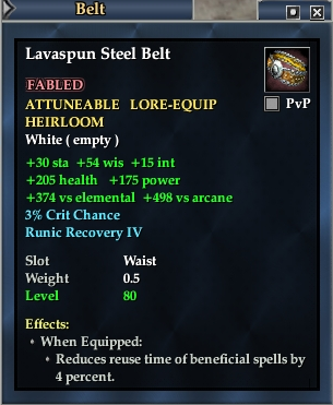 Lavaspun Steel Belt 76,461 pages on this wiki Edit Edit source History Talk 0 In-Game Examine Window Lavaspun Steel Belt other resources EQ2U · LootDB · EQ2LL · ZAM · Census xml Lavaspun Steel Belt FABLED ATTUNEABLE LORE-EQUIP HEIRLOOM +54 wis +15 int +30 sta +374 vs elemental +498 vs arcane 3% Crit Chance Runic Recovery IV Slot Waist Level 80 ( Tier 9 ) Effects: When Equipped: Reduces reuse time of beneficial spells by 4 percent.