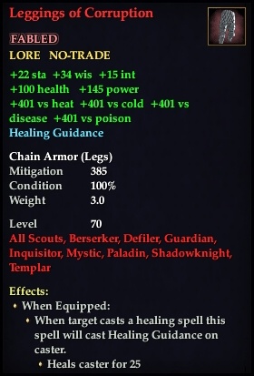 Leggings of Corruption 76,461 pages on this wiki Edit Edit source History Talk 0 In-Game Examine Window Leggings of Corruption other resources EQ2U · LootDB · EQ2LL · ZAM · Census xml Leggings of Corruption FABLED LORE NO-TRADE +34 agi +15 int +22 sta +401 vs elemental Healing Guidance Chain Armor ( Legs ) Mitigation 385 Level 70 ( Tier 8 ) All Scouts , Berserker , Guardian , Paladin , Shadowknight , Inquisitor , Templar , Defiler , Mystic Effects: When Equipped: When target casts a healing spell this spell will cast Healing Guidance on caster. Heals caster for 25