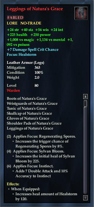 Leggings of Natura's Grace 76,461 pages on this wiki Edit Edit source History Talk 0 In-Game Examine Window Leggings of Natura's Grace other resources EQ2U · LootDB · EQ2LL · ZAM · Census xml Leggings of Natura's Grace FABLED LORE NO-TRADE +24 str +56 wis +24 int +40 sta +1,092 vs noxious +1,134 vs arcane 7% Crit Chance Focus: Healstorm VI Leather Armor ( Legs ) Mitigation 363 Level 80 ( Tier 9 ) Warden Effects: When Equipped: Increases heal amount of Healstorm VI by 120.