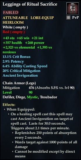 Leggings of Ritual Sacrifice 76,461 pages on this wiki Edit Edit source History Talk 0 In-Game Examine Window Leggings of Ritual Sacrifice other resources EQ2U · LootDB · EQ2LL · ZAM · Census xml Leggings of Ritual Sacrifice FABLED ATTUNABLE LORE-EQUIP HEIRLOOM +65 wis +21 int +43 sta +2,325 vs elemental +1,395 vs noxious 13.1% Crit Bonus 2.9% Potency 6.4% Ability Casting Speed Ancient Invigoration Chain Armor ( Legs ) Mitigation 476 Level 90 ( Tier 10 ) Defiler , Mystic , Dirge , Troubador Effects: When Equipped: On a healing spell cast this spell may cast Ancient Invigoration on target of spell cast. Lasts for 30.0 seconds. Triggers about 1.8 times per minute. Wards target against 1000 points of all damage Replenishes 250 points of absorption every 2 seconds. Cannot be modified except by direct means