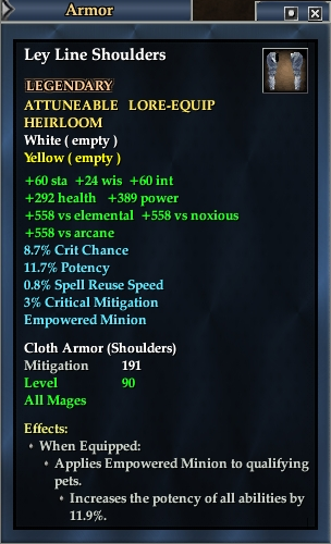 Ley Line Shoulders 76,461 pages on this wiki Edit Edit source History Talk 0 In-Game Examine Window Ley Line Shoulders other resources EQ2U · LootDB · EQ2LL · ZAM · Census xml Ley Line Shoulders LEGENDARY ATTUNEABLE LORE-EQUIP HEIRLOOM +24 wis +60 int +60 sta +558 vs elemental +558 vs noxious +558 vs arcane 8.7% Crit Chance 11.7% Potency 0.8% Spell Reuse Speed Empowered Minion Cloth Armor ( Shoulders ) Mitigation 191 Level 90 ( Tier 10 ) All Mages Effects: When Equipped: Applies Empowered Minion to qualifying pets. Increases base Spell and Combat Art damage of pet by 11.9%.