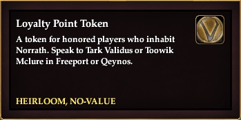 - The Loyalty Token Points can be spent in Qeynos Harbor or East Freeport by visiting Noble Toowik Mclure or Noble Tark Validus .