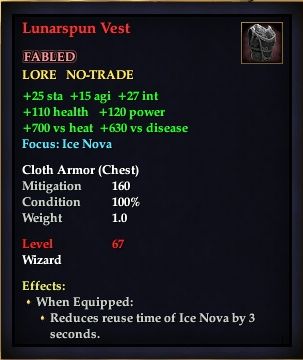 Lunarspun Vest 76,461 pages on this wiki Edit Edit source History Talk 0 In-Game Examine Window Lunarspun Vest other resources EQ2U · LootDB · EQ2LL · ZAM · Census xml Lunarspun Vest FABLED LORE NO-TRADE +15 agi +27 int +25 sta +700 vs elemental +630 vs noxious Focus:Ice Nova Cloth Armor ( Chest ) Mitigation 160 Level 67 ( Tier 7 ) Wizard Effects: When Equipped: Reduces reuse time of Ice Nova by 3 seconds.