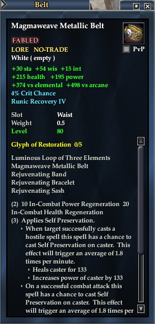 Magmaweave Metallic Belt 76,461 pages on this wiki Edit Edit source History Talk 0 In-Game Examine Window Magmaweave Metallic Belt other resources EQ2U · LootDB · EQ2LL · ZAM · Census xml Magmaweave Metallic Belt FABLED LORE NO-TRADE +54 wis +15 int +30 sta +374 vs elemental +498 vs arcane 4% Crit Chance Runic Recovery IV Slot Waist Level 80 ( Tier 9 ) Effects: When Equipped: Reduces reuse time of beneficial spells by 4 percent.
