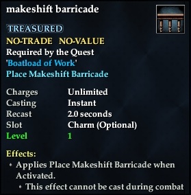 Makeshift barricade 76,461 pages on this wiki Edit Edit source History Talk 0 In-Game Examine Window Makeshift barricade other resources EQ2U · LootDB · EQ2LL · ZAM · Census xml Makeshift barricade TREASURED NO-TRADE NO-VALUE Required by the Quest ' Boatload of Work ' Place Makeshift Barricade Charges Unlimited Casting Instant Recast 2.0 Slot Charm (Optional) Level 1 ( Tier 1 ) Effects: Applies Place Makeshift Barricade when Activated. This effect cannot be cast during combat