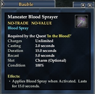 Maneater Blood Sprayer 76,461 pages on this wiki Edit Edit source History Talk 0 In-Game Examine Window Maneater Blood Sprayer other resources EQ2U · LootDB · EQ2LL · ZAM · Census xml Maneater Blood Sprayer NO-TRADE, NO-VALUE Required by the Quest 'In the Blood?' Blood Spray Charges Unlimited Casting 2.0 Duration 15.0 Recast 5.0 Slot Charm (Optional) Effects: Applies Blood Spray when Activated. Lasts for 15.0 seconds.
