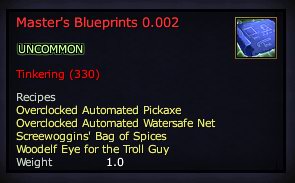 Master's Blueprints 0.002 76,461 pages on this wiki Edit Edit source History Talk 0 In-Game Examine Window Master's Blueprints 0.002 other resources LootDB · EQ2LL · ZAM · EQ2U · Census xml EverQuest II Recipe Book Information Master's Blueprints 0.002 UNCOMMON Tinkering (330) Recipes Overclocked Automated Pickaxe (t7) Overclocked Automated Watersafe Net (t7) Screewoggins' Bag of Spices (t6) Woodelf Eye for the Troll Guy (t6) Obtain: Buy from Fizza Cogsworth Link: What does this information mean? Categories : Recipe Books Tinkering Recipe Books Uncommon Recipe Books Add category Cancel Save