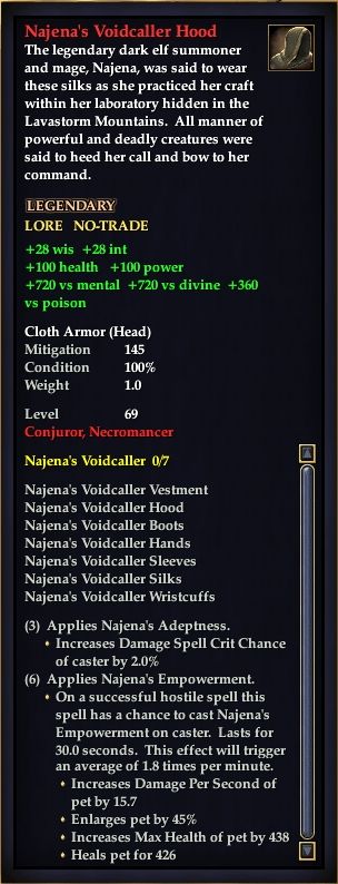 The legendary dark elf summoner and mage, Najena, was said to wear these silks as she practiced her craft within her laboratory hidden in the Lavastorm Mountains. All manner of powerful and deadly creatures were said to heed her call and bow to her command.