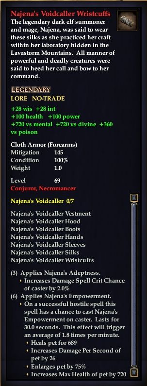 The legendary dark elf summoner and mage, Najena, was said to wear these silks as she practiced her craft within her laboratory hidden in the Lavastorm Mountains. All manner of powerful and deadly creatures were said to heed her call and bow to her command.
