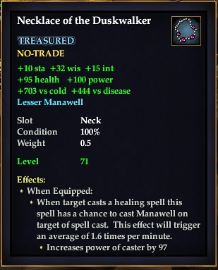 Necklace of the Duskwalker 76,461 pages on this wiki Edit Edit source History Talk 0 In-Game Examine Window Necklace of the Duskwalker other resources EQ2U · LootDB · EQ2LL · ZAM · Census xml Necklace of the Duskwalker TREASURED NO-TRADE +32 wis +15 int +10 sta +703 vs elemental +444 vs noxious Lesser Manawell Slot Neck Level 71 ( Tier 8 ) Effects: When Equipped: When target casts a healing spell this spell has a chance to cast Manawell on target of spell cast. This effect will trigger an average of 1.6 times per minute. Increases power of caster by 97