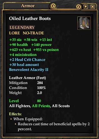 Oiled Leather Boots 76,461 pages on this wiki Edit Edit source History Talk 0 In-Game Examine Window Oiled Leather Boots other resources EQ2U · LootDB · EQ2LL · ZAM · Census xml Oiled Leather Boots LEGENDARY ATTUNEABLE LORE-EQUIP HEIRLOOM +38 wis +15 int +35 sta +332 vs elemental +498 vs noxious +4 Ministration 2% Crit Chance +30 Ability Modifier Benevolent Alacrity II Leather Armor ( Feet ) Mitigation 348 Level 80 ( Tier 9 ) All Fighters , All Priests , All Scouts Effects: When Equipped: Reduces cast time of beneficial spells by 2 percent