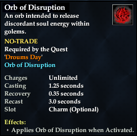 Orb of Disruption 76,461 pages on this wiki Edit Edit source History Talk 0 In-Game Examine Window Orb of Disruption other resources EQ2U · LootDB · EQ2LL · ZAM · Census xml Orb of Disruption An orb intended to release discordant energy within golems. NO-TRADE Required by the Quest ' Droums Day ' Orb of Disruption Charges Unlimited Casting 1.25 seconds Recast 3.0 seconds Slot Charm (Optional) Effects: Applies Orb of Disruption when activated.
