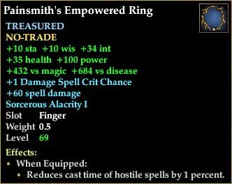Painsmith's Empowered Ring 76,461 pages on this wiki Edit Edit source History Talk 0 In-Game Examine Window Painsmith's Empowered Ring other resources EQ2U · LootDB · EQ2LL · ZAM · Census xml Painsmith's Empowered Ring TREASURED NO-TRADE +10 wis +34 int +10 sta +684 vs noxious +432 vs arcane 1% Crit Chance +60 Ability Modifier Sorcerous Alacrity I Slot Finger Level 69 ( Tier 7 ) Effects: When Equipped: Reduces cast time of hostile spells by 1 percent.
