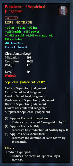 Pantaloons of Sepulchral Judgement 76,461 pages on this wiki Edit Edit source History Talk 0 In-Game Examine Window Pantaloons of Sepulchral Judgement other resources EQ2U · LootDB · EQ2LL · ZAM · Census xml Pantaloons of Sepulchral Judgement FABLED LORE NO-TRADE +32 str +52 int +52 sta +1,092 vs elemental +1,134 vs arcane -10% Hate Gain Focus: Upheaval Cloth Armor ( Legs ) Mitigation 202 Level 80 ( Tier 9 ) Warlock Effects: When Equipped: Reduces the recast of Upheaval by 30 seconds.