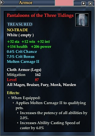 Pantaloons of the Three Tidings 76,461 pages on this wiki Edit Edit source History Talk 0 In-Game Examine Window Pantaloons of the Three Tidings other resources EQ2U · LootDB · EQ2LL · ZAM · Census xml Pantaloons of the Three Tidings TREASURED NO-TRADE +12 wis +32 int +32 sta 0.6% Crit Chance 7.5% Crit Bonus Molten Carnage II Cloth Armor ( Legs ) Mitigation 162 Level 87 ( Tier 9 ) All Mages , Bruiser , Fury , Monk , Warden Effects: When Equipped: Applies Molten Carnage II to qualifying pets. Increases the potency of all abilities by 2.0%. Increases Ability Casting Speed of caster by 6.0%