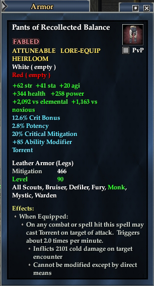 Pants of Recollected Balance 76,461 pages on this wiki Edit Edit source History Talk 0 In-Game Examine Window Pants of Recollected Balance other resources EQ2U · LootDB · EQ2LL · ZAM · Census xml Pants of Recollected Balance FABLED ATTUNEABLE LORE-EQUIP HEIRLOOM +62 str +20 agi +41 sta +2,902 vs elemental +1,163 vs noxious 12.6% Crit Bonus 2.8% Potency +85 Ability Modifier Torrent Leather Armor ( Legs ) Mitigation 382 Level 90 ( Tier 10 ) All Scouts , Bruiser , Defiler , Fury , Monk , Mystic , Warden Effects: When Equipped: On any combat or spell hit this spell may cast Torrent on target of attack. Triggers about 2.0 times per minute. Inflicts 1192 cold damage on target encounter Must not be engaged in pvp combat Cannot be modified except by direct means Must not be engaged in pvp combat This item may not be used in a PvP zone.